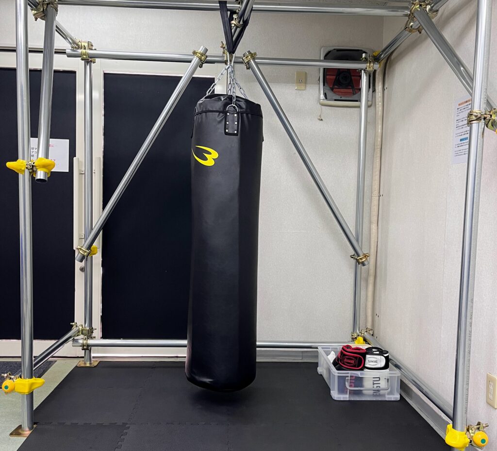 サンドバッグスタンドではなく組み上げた単管パイプからサンドバッグを吊り下げるので、ボクシングジム同様の打ちごたえのあるトレーニングが可能です。